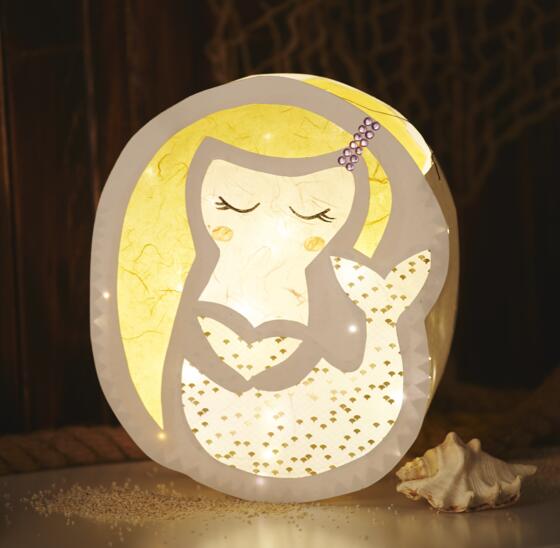 Stáhněte si bezplatnou šablonu motivu a vytiskněte ji. přeneste siluetu mořské panny dvakrát na bílou kartu a vše vystřihněte. Vnitřek lucerny polepte barevným slaměným hedvábím nebo barevným papírem Décopatch. K tomu se hodí zejména řemeslné lepidlo, které můžete na lepené plochy nanášet štětcem. Černým fixem vybarvěte zavřené oči. Na tváře vystřihněte z lososového nebo růžového slaměného hedvábí dva ovály a přilepte je na obličej trochou řemeslného lepidla. Nalepte drahokamy jako sponky do vlasů.