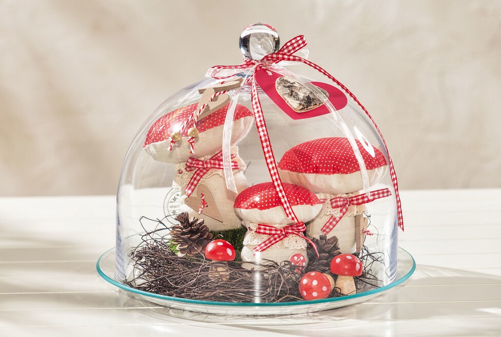 Na skleněné desce vytvořte malé hnízdo pomocí ozdobné nitě a mechu . Látkové houby umístěte společně s malými šiškami a mini dekorativními houbami a vytvořte tak přírodní aranžmá. Ujistěte se, že skleněný uzávěr přiléhá k vaší dekoraci.