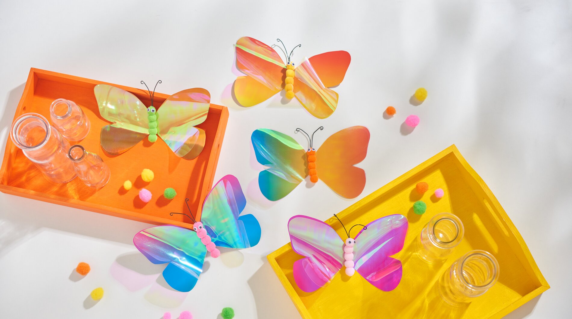 Odstřihněte 12 cm drátu, přeložte ho uprostřed a dole přitiskněte k sobě tak, aby oba konce drátu tvořily tykadla. Pomocí kulatých kleští tykadla vytvarujte. Na hlavičku bambulky naneste tečku lepidla a tykadla přilepte. Nakonec přilepte tělo na křídla.