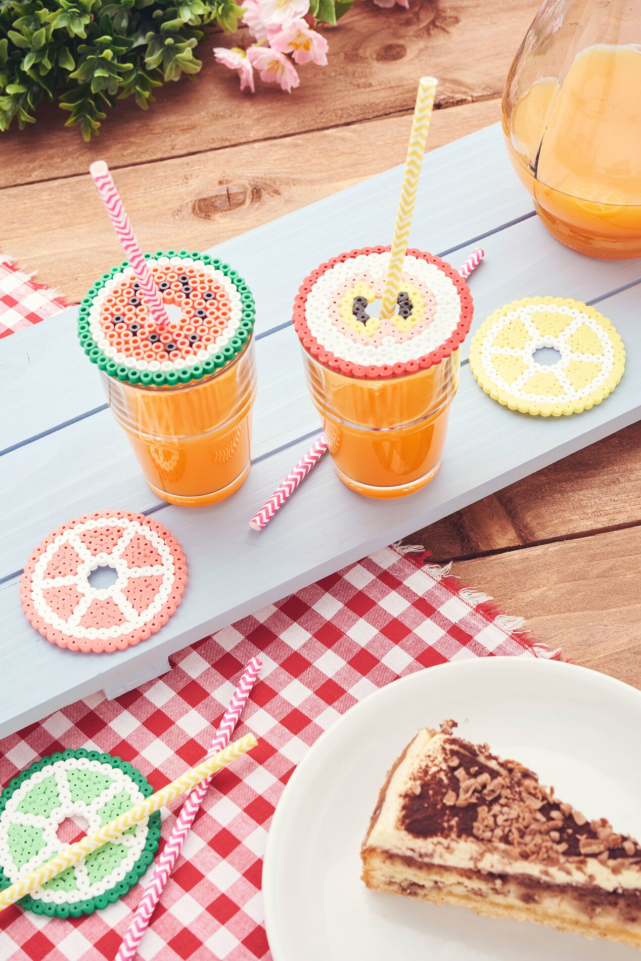 Kromě korálků Hama potřebujete pouze kulaté kolíčky Hama. Korálky rozmístěte podle vlastního vkusu nebo, jako v tomto nápadu, do podoby rozkrojeného ovoce: V tomto případě se jedná o plátky citronu, limetky, pomeranče, jablka nebo melounu. Střed destičky ponechte prázdný, aby později zůstal malý otvor pro brčko.