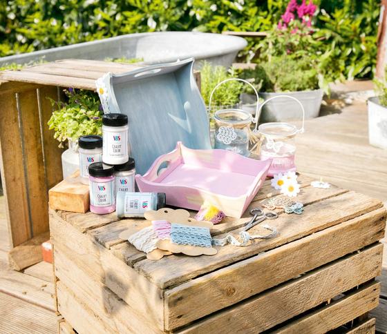 Mísy na podnosu natřete křídově bílou barvou a malířskou houbičkou. Jakmile barva zaschne, vše se natře vrstvou vosku Chalky Wax. Po opětovném zaschnutí naneste třetí vrstvu barvy Chalky Colour, například v pastelově růžové nebo petrolejově modré barvě. Jakmile i tato třetí vrstva barvy zaschne, vrchní vrstva barvy se opět lehce obrousí: na plochách opatrně, na okrajích o něco více. Předtím nanesený vosk slouží k ochraně spodní barevné vrstvy před přílišným otěrem.
