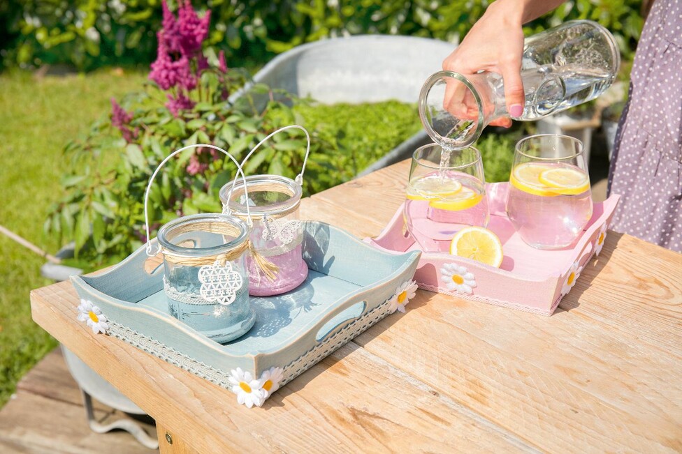 Nakonec podnosy a skleněné lucerny ozdobte podle vlastního vkusu krajkovými okraji, drobnými květy sedmikrásek, rozsypanými kousky, přírodní rafií nebo vlastními dekorativními nápady.
