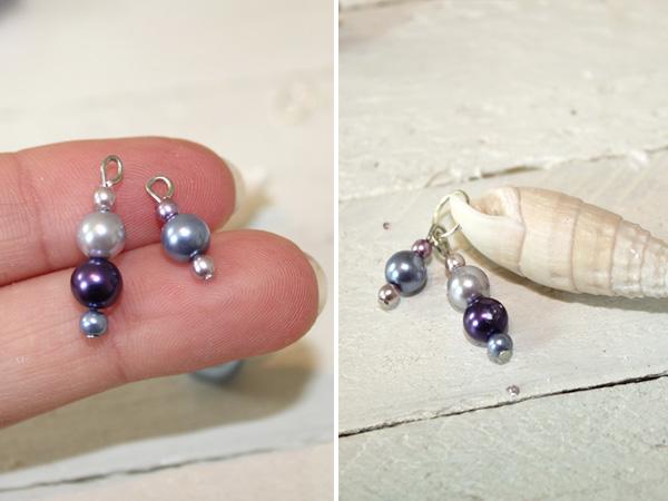 Vezměte tři velké ploché skořápky a do horního středu každé z nich vyvrtejte otvor. Navlékněte požadované korálky na hranolový kolík a prostrčte jej otvorem ve skořápce. Vyčnívající konec kolíku vytvarujte pomocí kleští do očka. Pokud je příliš dlouhý, zkraťte jej bočními štípacími kleštěmi. Před uzavřením očka připevněte řetízkový špendlík, na který rovněž navlékněte perly. Na koncové očko se připevní háček do ucha.