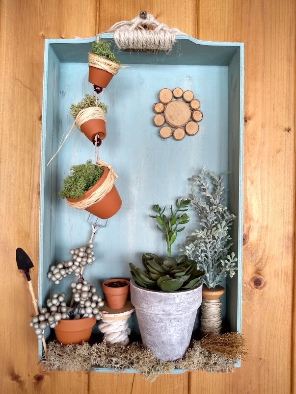 Vyberte si tři malé květináče různých velikostí a zabalte je do přírodní rafie a upevněte je na místě pomocí horkého lepidla. Nejmenším terakotovým květináčem protáhněte shora provázek v přírodní barvě a zauzlujte ho pod základnou dřevěným korálkem. Stejnou nit nyní protáhněte dalším květináčem a opět ji zajistěte dřevěným korálkem. Protáhne se i třetím, největším terakotovým květináčem a opět se zakončí dřevěným korálkem. Horní konec nitě lze nyní přivázat k rukojeti podnosu a zajistit horkým lepidlem, čímž vznikne malý etážový květináč.