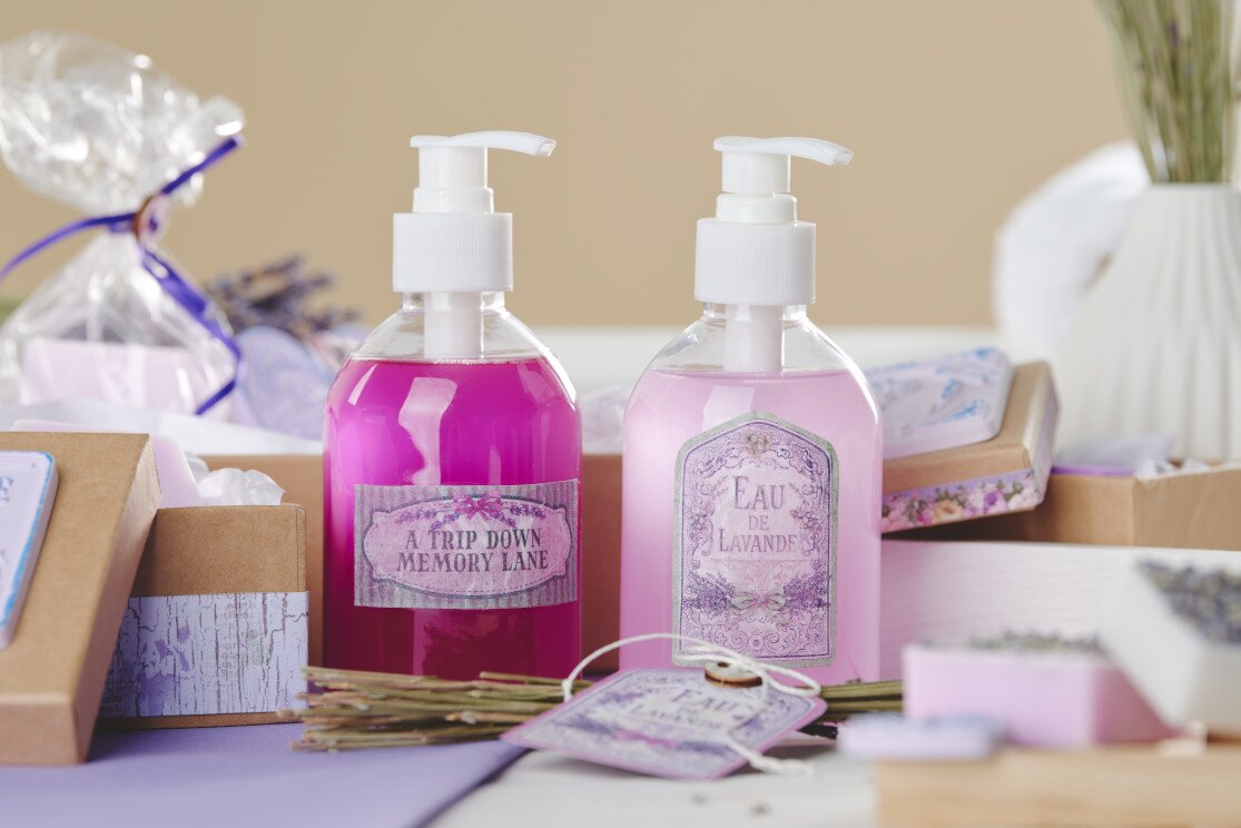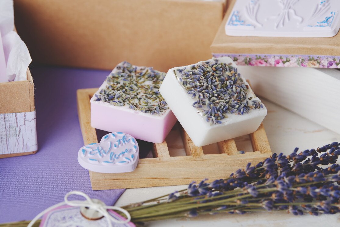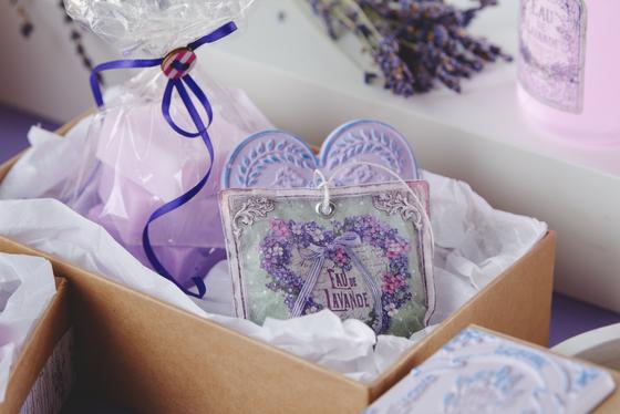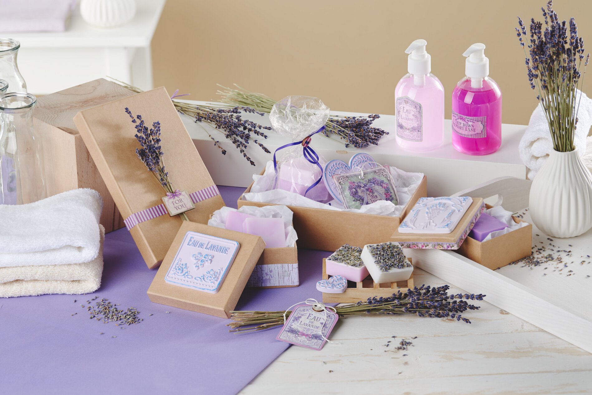 S pomocí slaměného hedvábí, laserem vyřezávaných motivů a kytic levandule je zábavné vytvořit z obyčejných kartonových krabic láskyplně zdobené dárkové balení mýdel.