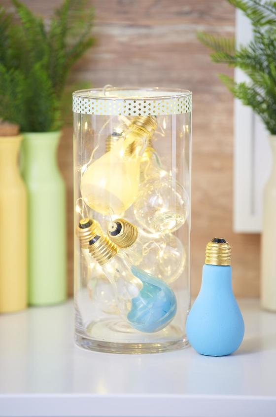 Chcete-li obarvit žárovky, naplňte žárovku žlutou barvou a pomalu s ní otáčejte, aby se barva dobře rozprostřela. Tento postup zopakujte s modrou řemeslnou barvou pro namodralou žárovku. V našem příkladu jsme smíchali řemeslnou barvu