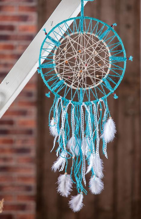 Zdobení a peříBez dřevěných korálků a peříček se lapač snů téměř neobejde. Lapač snů zavěste na háček a do spodní čtvrtiny přivažte jutové stuhy nebo odpovídající stuhu s peříčky a korálky.