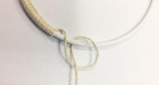Nyní omotejte osnovní přízi přírodní barvy širokými smyčkami kolem malé kovové obruče. Jakmile je omotáno celé kolo, omotá se příze stejným způsobem do smyček prvního kola v kole druhém.