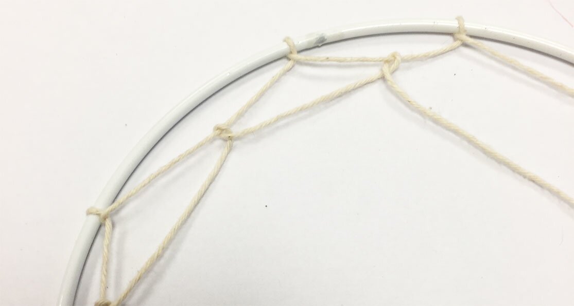 Na zelený lapač snů budete potřebovat jeden kovový kroužek o průměru 10 cm a jeden o průměru 15 cm. Malý kroužek omotejte bílou osnovní přízí a velký kroužek zelenou jutovou přízí. Příze se smyčkuje a vždy se zauzluje ve stejném bodě, aby vznikl úhledný omotaný vzhled.