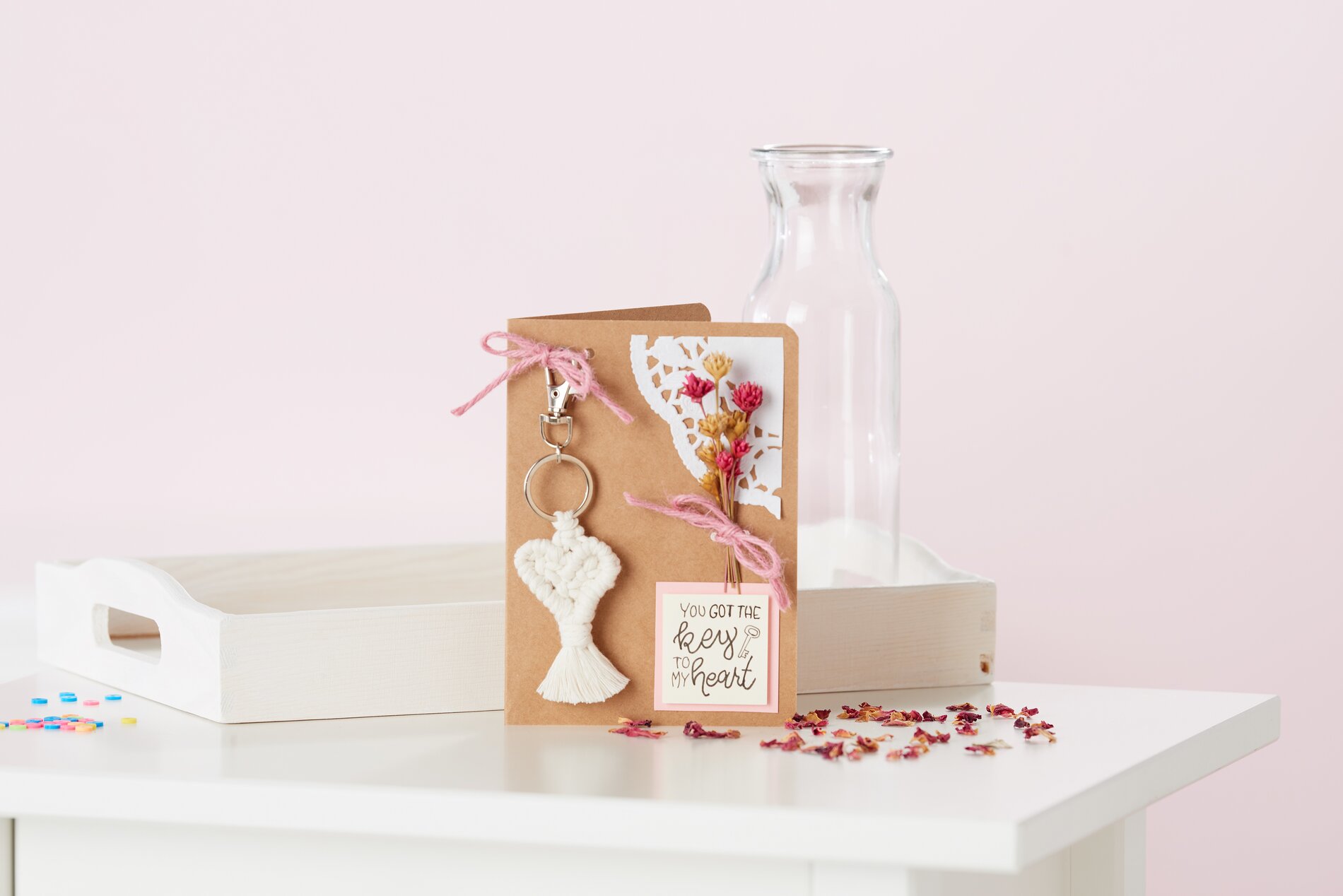 Pomocí děrovačky vyražte do karty otvory pro připevnění přívěsku na klíče a kytice květin. Provlékněte jutovou šňůrku a uzavřete ji mašlí na přední straně.