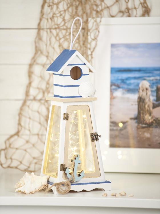 natřete bílou řemeslnou barvou. Po zaschnutí ozdobte maják tmavě modrou a béžovou řemeslnou barvou a vyměňte police.