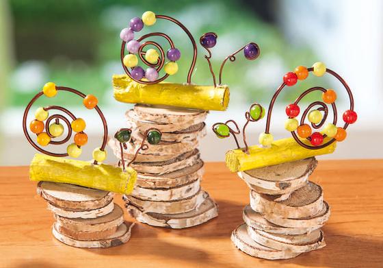 Druhý konec přilepte do předvrtaného otvoru. Na plášť budete potřebovat asi 20 cm silného drátu. Opět na něj nalepte dřevěný korálek a konec drátu kolem něj omotejte. Poté na drát nalepte další barevné dřevěné korálky a ohněte jej do spirály. Konec přilepte do předvrtaného otvoru. Drátky můžete také zafixovat trochou řemeslného lepidla, aby lépe držely. Hotové šneky pak můžete přilepit na několik plátků kůry nalepených na sobě.