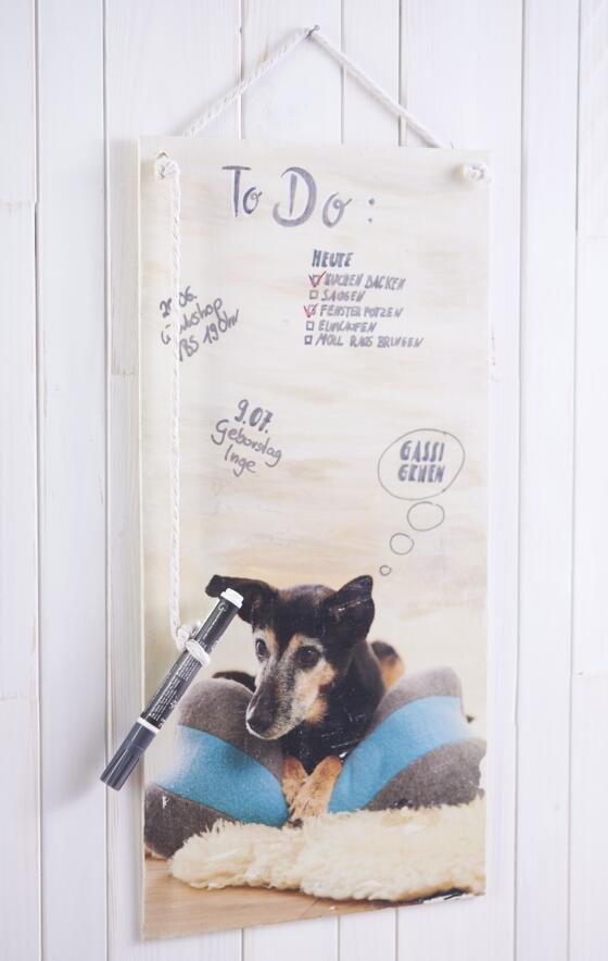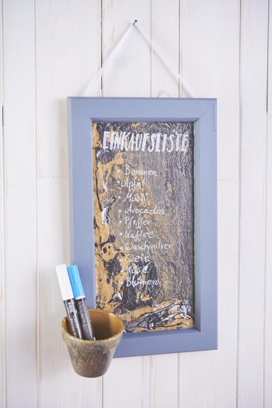 Nyní položte na kelímek obrázek v rámečku lícem dolů a vše otočte tak, aby byl kelímek na rámečku vzhůru nohama. Nyní chvíli počkejte, než kelímek zvednete. Rámeček trochu otočte dopředu a dozadu, aby se vnitřní plochy zcela pokryly barvou. Barva pak musí schnout nejméně 24 hodin. Vnější okraj rámu natřete barvou VBS craft v šedé barvě. Nyní natřete vnitřní část třemi vrstvami bezbarvé tabulové barvy. Dbejte na to, abyste nátěry nanášeli střídavě vodorovně a svisle, a počítejte s dobou schnutí mezi jednotlivými nátěry. Po úplném zaschnutí můžete na povrch tabule psát křídovými fixy tak často, jak je potřeba. Staré poznámky lze odstranit vlhkým hadříkem.
