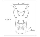 Tyto roztomilé mini sáčky "velikonoční zajíček" mají rozměry přibližně 13 x 7 x 18 cm. Sada obsahuje materiál na 5 roztomilých sáčků s velikonočním zajíčkem, které můžete naplnit.