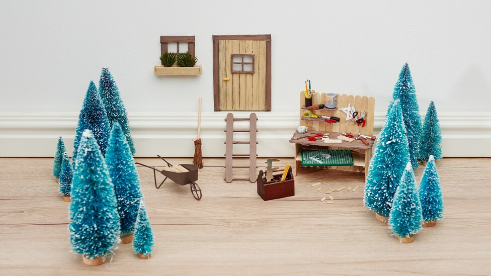 Nejprve nůžkami nastříhejte dřevěné špachtle a tyčinky a pomocí lepidla je slepte dohromady tak, aby vytvořily pracovní stůl, dveře a okno.