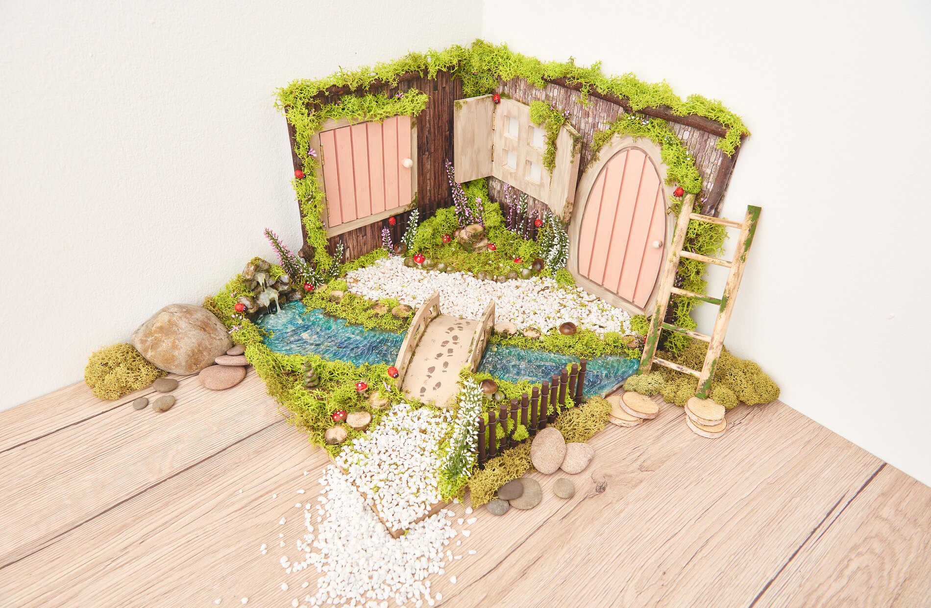 Scénu dotvořte přidáním mechu, nastříhaného vřesu, hub, dřevěných disků a malých berušek. Tyto detaily oživí váš miniaturní svět a dodají mu realistický vzhled.