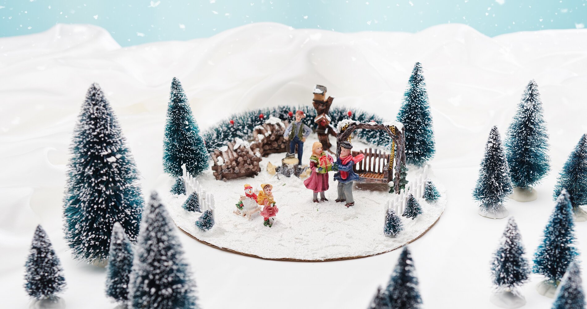 Karton natřete dekorativním sněhem. Dokud je sníh ještě mírně vlhký, lze miniatury umístit dovnitř. Tím se figurky zafixují na svém místě.