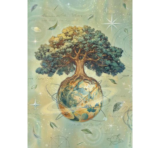 Objevte kouzlo nového začátku s Motiv rýžový papír "A New Beginning - The World Tree". Tento inspirativní vzor zobrazuje mohutný strom trůnící na zeměkouli, obklopený vesmírem plným listů, hvězd a planet. Popusťte uzdu své kreativitě a vytvářejte jedinečná umělecká díla s tímto všestranným přírodním papírem.