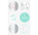Tyto samolepky " Hodně štěstí" o průměru cca 4 cm jsou k dispozici ve stříbrné, bílé a tyrkysové barvě . Obdržíte 24 samolepek se 6 motivy.
