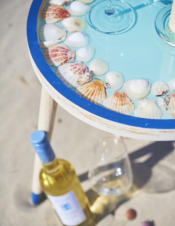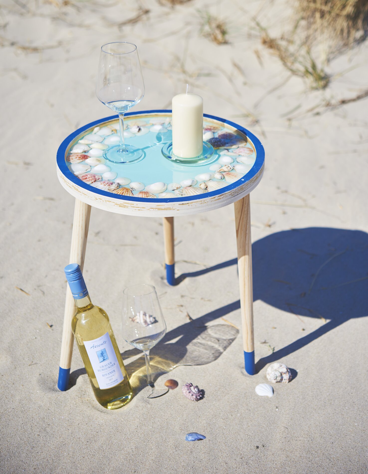 Prvním krokem je natření stolu místy řemeslnou barvou. Na vnitřní povrch můžete použít tyrkysově modrou barvu, která připomíná moře. My jsme hrany a nohy stolu natřeli výraznou modrou barvou. Barvy nechte důkladně zaschnout. V případě potřeby můžete nanést druhou vrstvu barvy, pokud některé části dřeva stále prosvítají.
