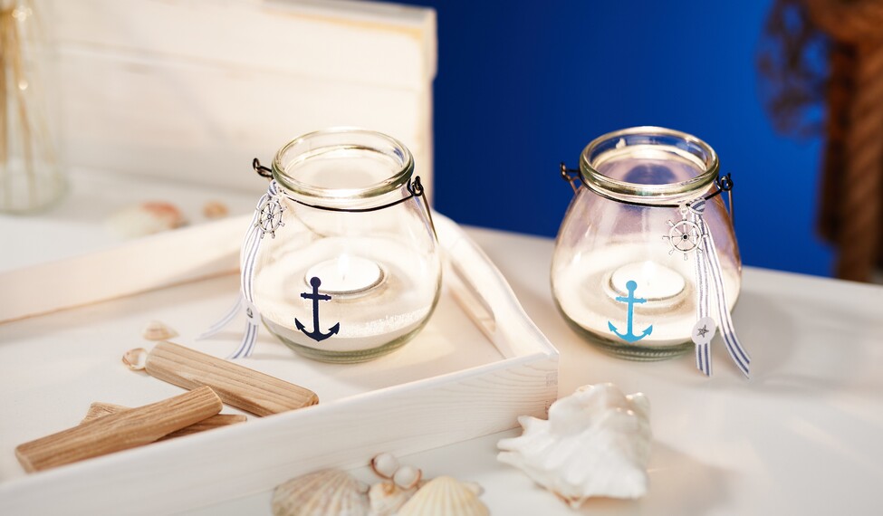 Prvním krokem je vykrojení kotvy z tmavě modrého a světle modrého kartonu. Ty přilepte k lucerničkám trochou řemeslného lepidla. Poté na ramena sklenic přivažte kousek pruhované stuhy. Špičky můžete zastřihnout pod úhlem. Dále přivažte přívěsky ke sklenicím pomocí osnovní příze. Nyní už jen vyražte děrovaná kolečka a přilepte je ke stuhám.