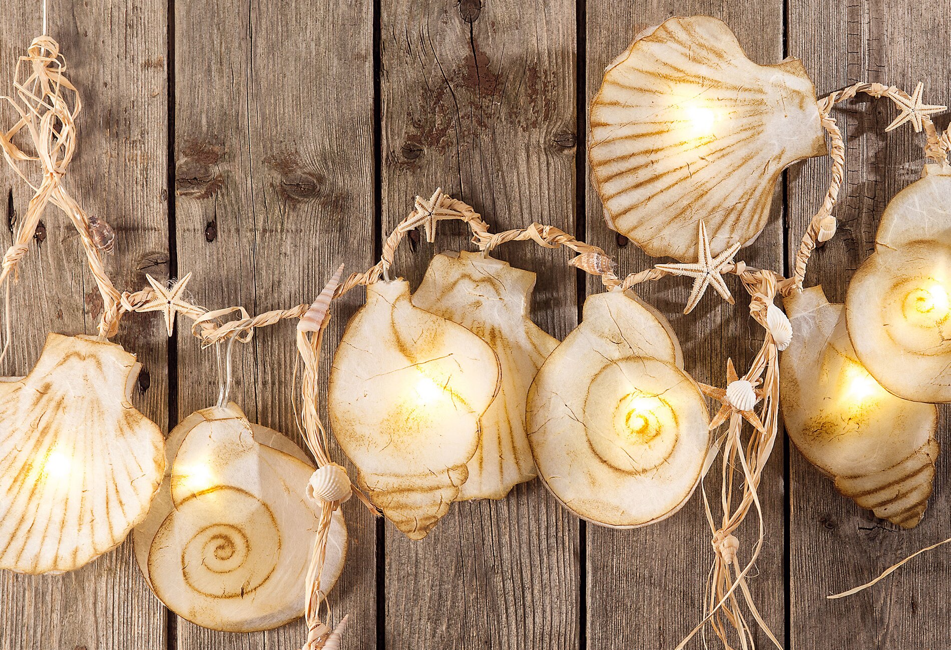 U tohoto námořního světelného řetězu jsou mušle vyřezány z fólie na lampy a mají reliéfní obrysy. Přírodní rafie a skutečné mušle dotvářejí letní vzhled.