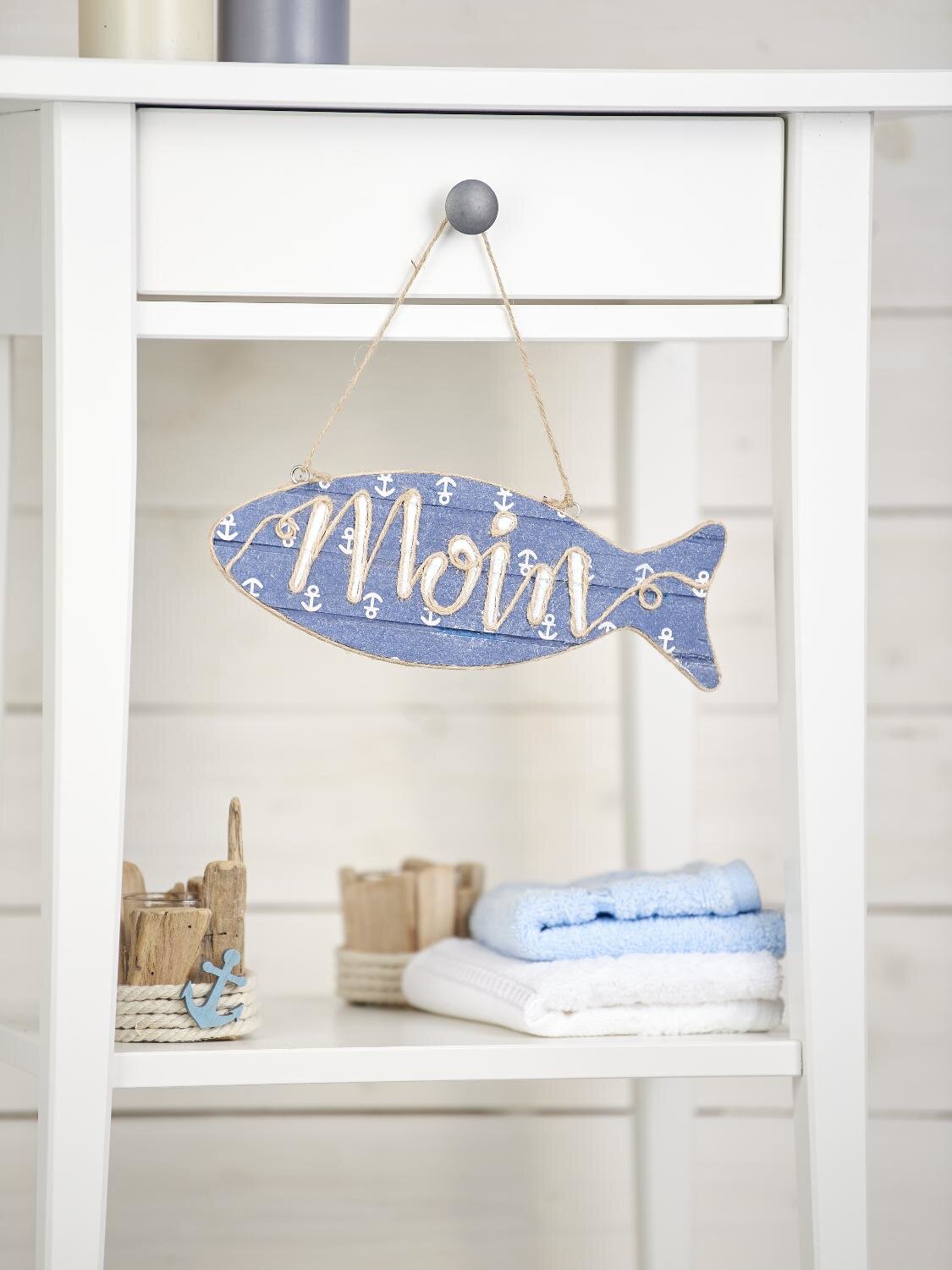 Znak ryby je kompletně zakrytý ubrouskem . Bílé vrstvy papíru se odstraní, takže zůstane pouze potištěná vrstva papíru. Dřevěnou ceduli natřeme ubrouskovou barvou a opatrně naneseme vrstvu ubrousku. Na rybu se nyní fixem napíše slovo "Moin" nebo jiný vzkaz. Ten se obkreslí fixem Posca a poté se vybarví.