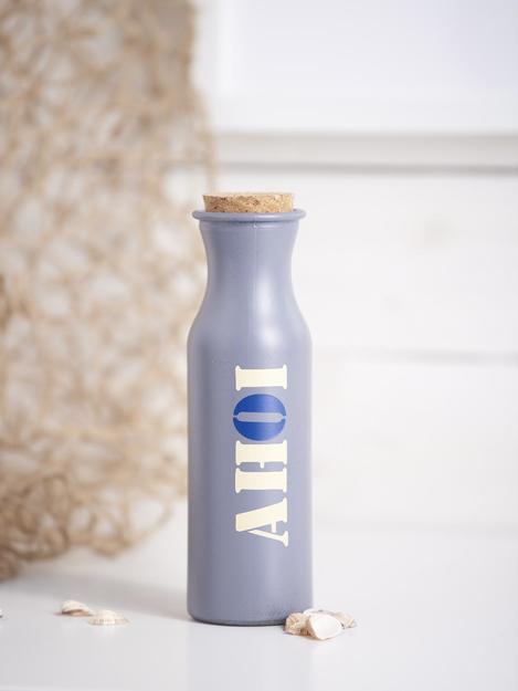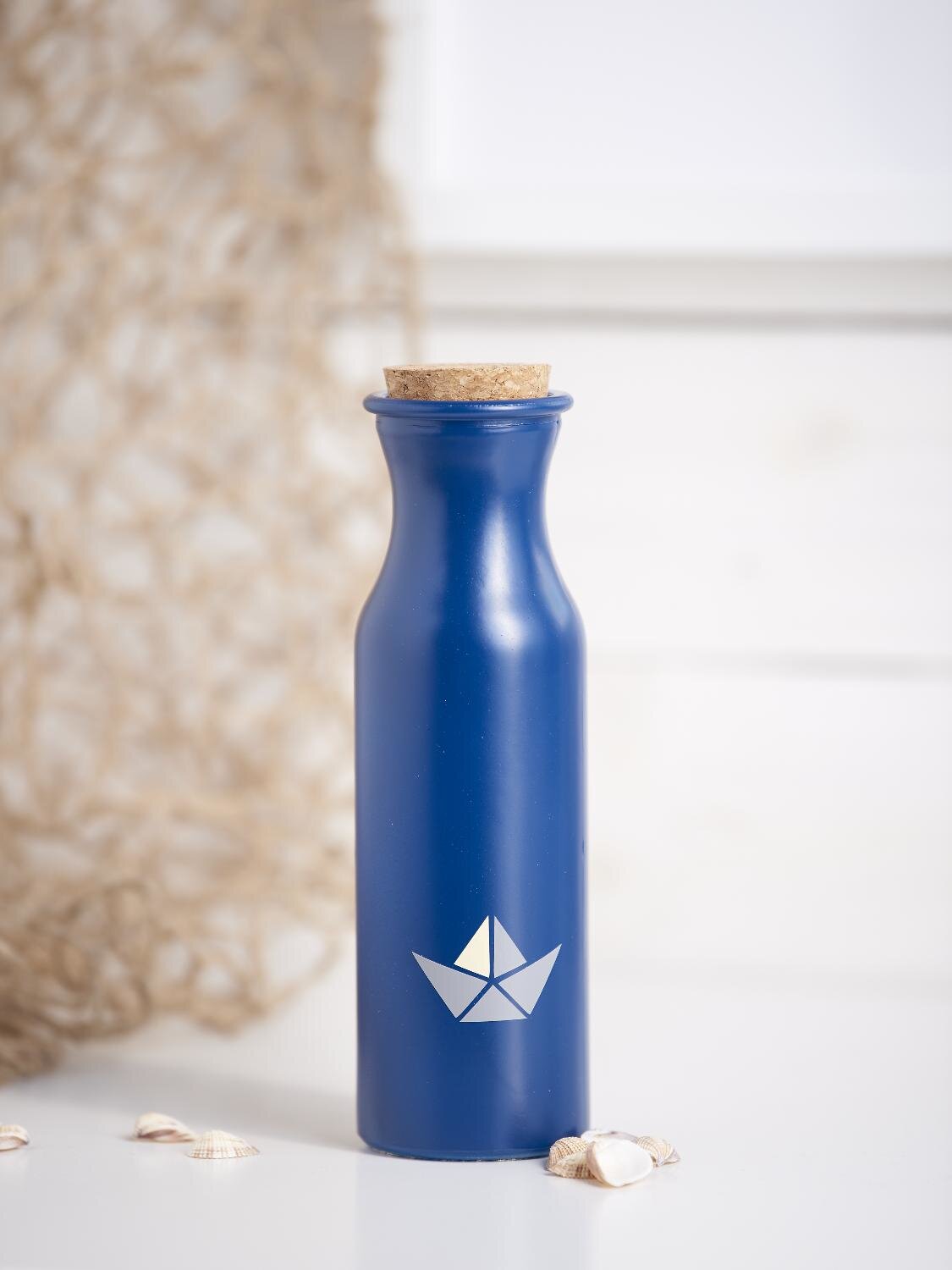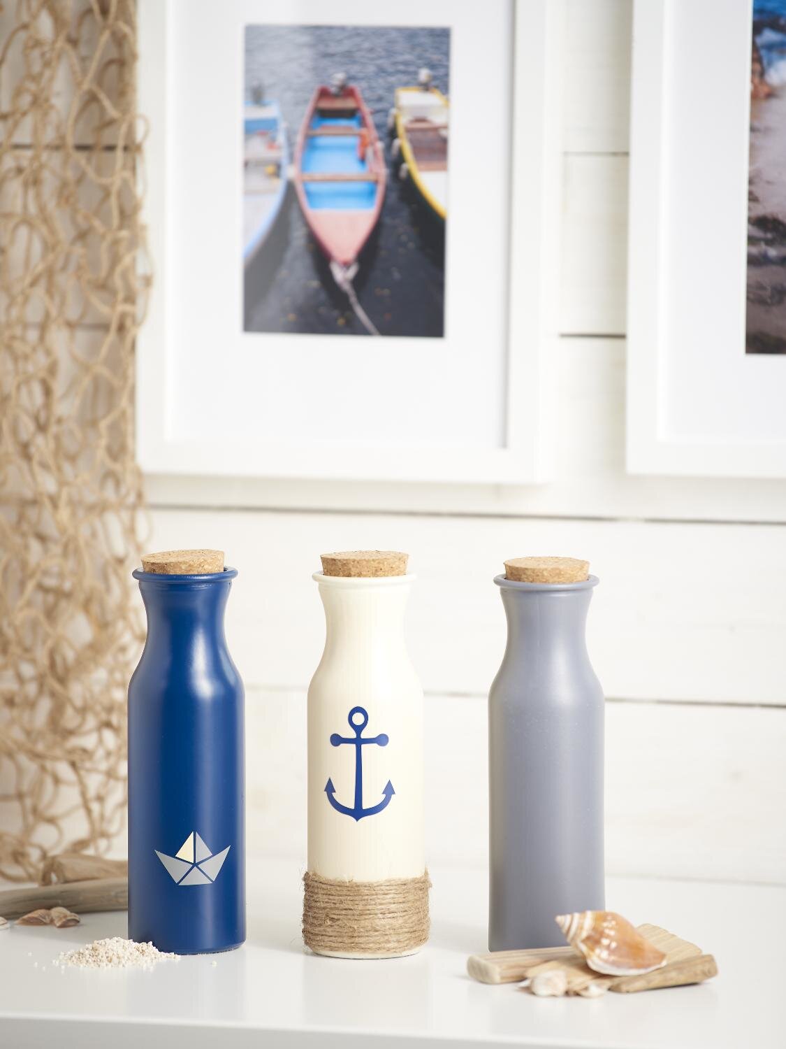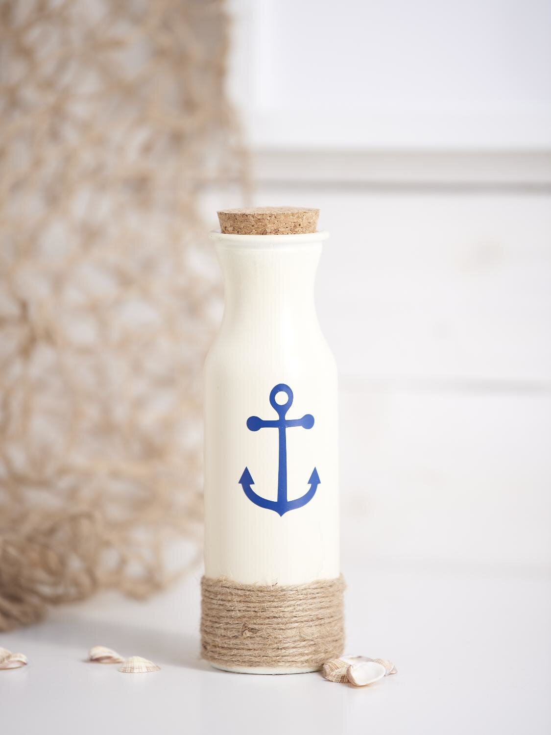 plotrového stroje vytiskněte námořní motivy podle vlastního vkusu na samolepicí vinylovou fólii a umístěte je na barevné vysušené skleněné lahve.