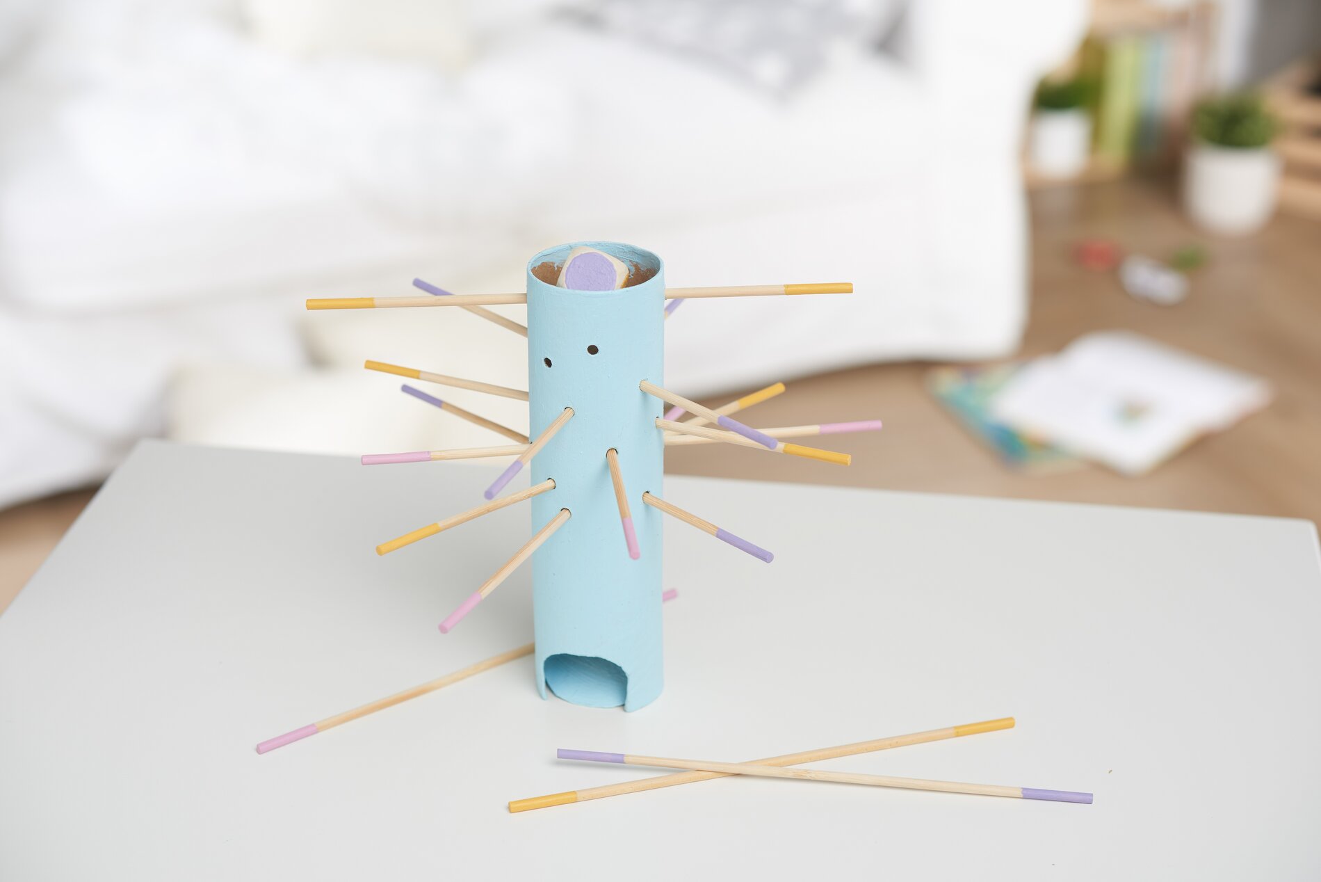 Nyní natřete kartonovou ruličku oblíbenou barvou a konce (2 cm) 4 špejlí, každou ve stejné barvě (12 špejlí ve 3 barvách, včetně 4 špejlí v jedné barvě).