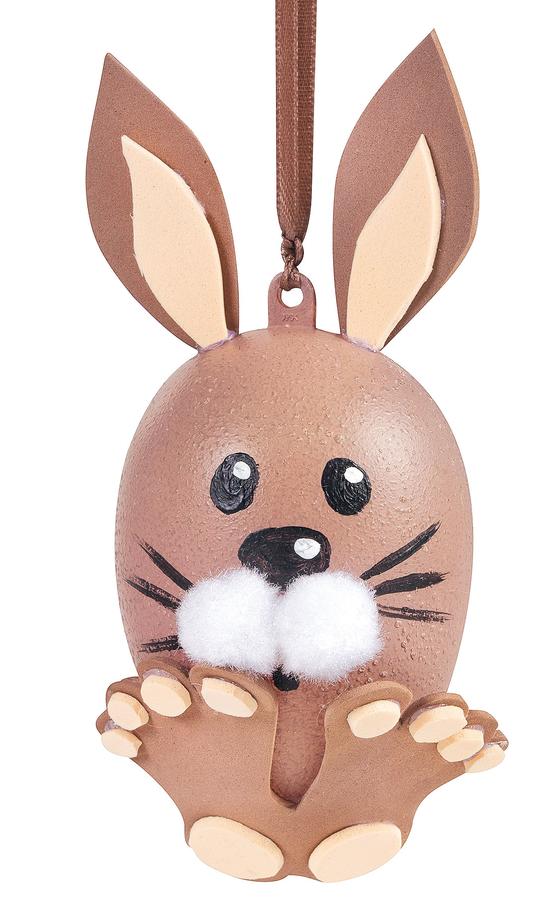 Zatímco barva zasychá, lze uši a nohy přenést z šablony na pěnovou gumu a poté je vystřihnout. Pomocí horkého lepidla slepte uši a nohy z pěnové gumy k sobě a poté je připevněte k akrylové fólii. Na obličej namalujte oči, nos, ústa a vousy pomocí jemného štětce a černé řemeslné barvy. Jakmile barva zaschne, naneste do očí a na nos malou tečku barvy slonové kosti. Tím akrylový zajíček ožije. Nyní už jen přilepte bílé bambulky jako buclaté tvářičky a huňatý ocásek. Jako závěsná stuha poslouží saténová stuha, která se na vajíčko zauzluje - roztomilý akrylový velikonoční zajíček je hotový.