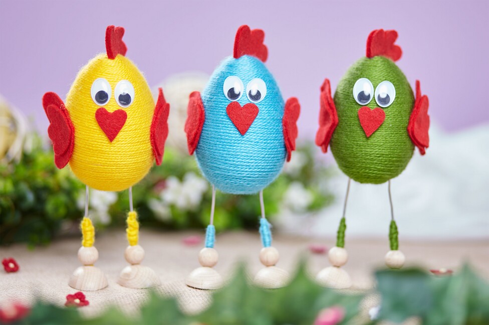 Na každou nohu kuřátka uřízněte asi 13 cm dlouhý kousek hliníkového drátu. Drátek vlepte do dřevěných nožiček, na každý drátek nasuňte dřevěnou kuličku a slepte je k sobě. Nyní lze nožičky zasunout asi 3 cm do polystyrenového vajíčka a stočit je do tvaru. Kolem nožiček omotejte vlnu, abyste vytvořili roztomilé manžety.
