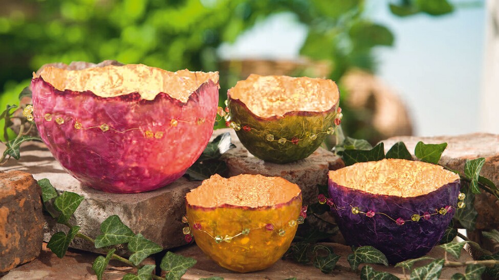 Po zaschnutí poslední vrstvy balónky opatrně rozřízněte a vyjměte. přebytečné lepidlo odstřihněte nůžkami. Potřete vnitřek lucerny lepidlem a nechte přibližně 30 minut zaschnout. Poté naneste kovové listy štětinovým štětcem a pevně je rozetřete. Tip: Zbytky lepidla lze sbírat a znovu nanášet.