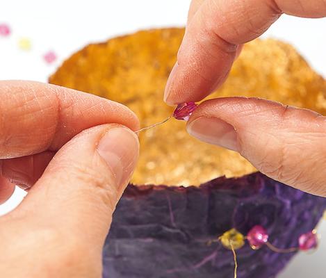 Volná místa znovu natřete aplikačním mlékem a přidejte kovový list. Celý vnitřní povrch uzavřete vrchním nátěrem. Okraje setřete malířskou houbičkou řemeslnickou barvou v barvě aubergine. Po zaschnutí udělejte do lucerny otvory a provlékněte jimi drátek ve zlaté barvě a akrylové korálky. Tip: Korálky provlékněte dvakrát, abyste je zajistili. Konce drátků v lucerně stočte k sobě a zkraťte je.