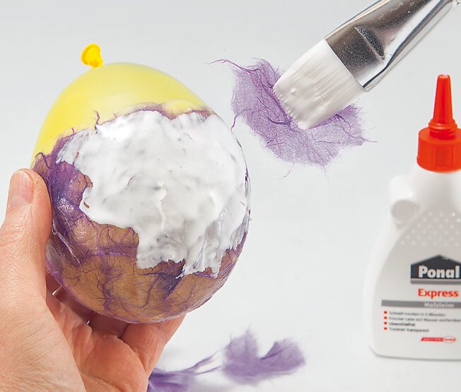 Balónek jednoduše potáhněte hedvábnou slámou , nechte zaschnout a balónek rozřízněte. Vzniklou "skořápku" zevnitř pomocí mléka a kovových lístků pozlaťte a zvenku obarvěte.