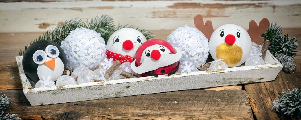 Z pěnové gumy vystřihněte sobí parohy, Santův knír a tučňákův zobák a oči a nalepte je na baňky. Nalepte malé červené bambulky jako nosy a nakonec černým fixem vybarvěte oči sněhuláka, Santy a soba. Otce Vánoc můžete také ozdobit černými knoflíky a sněhulákovi dát pěknou šálu s červenou stuhou.