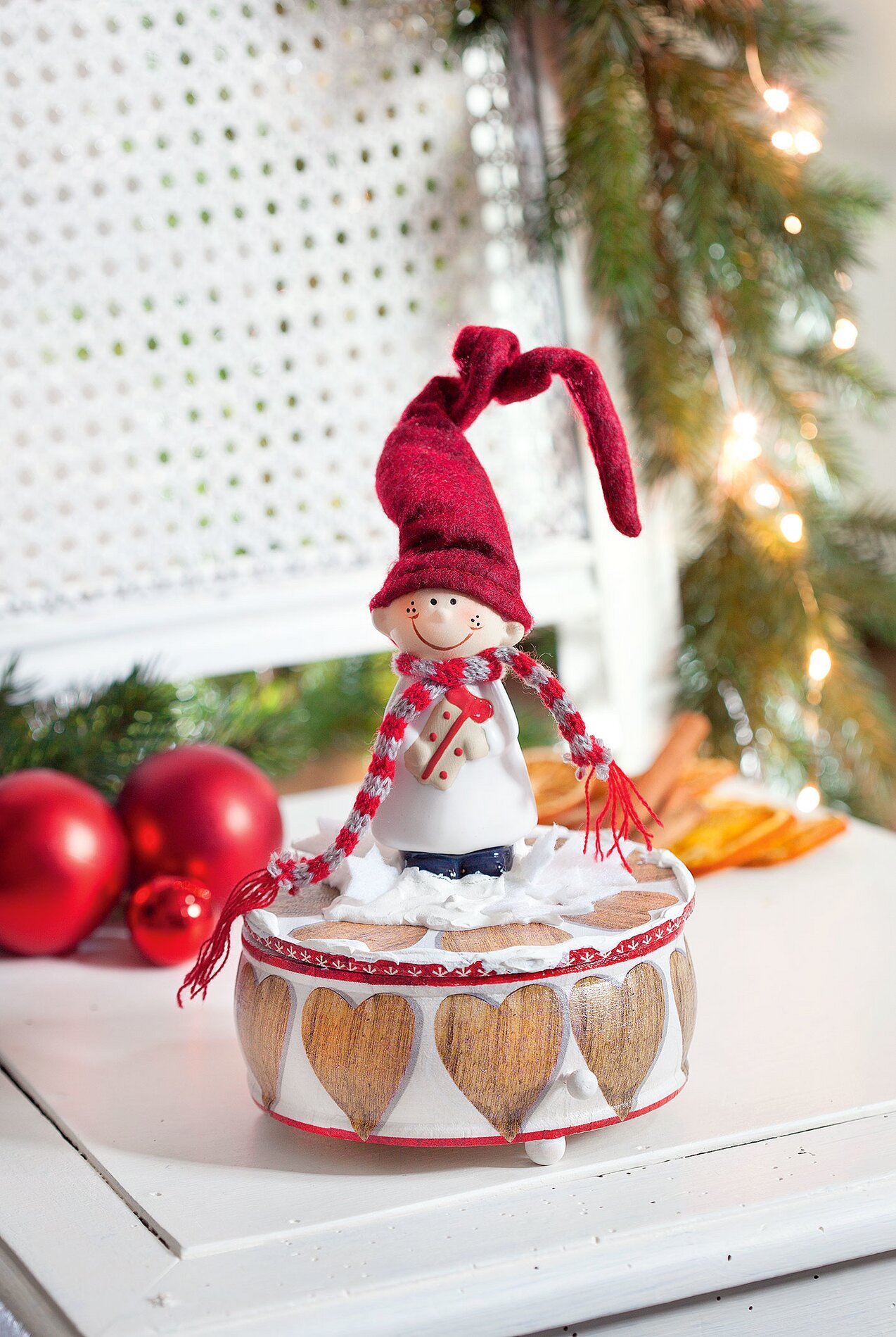Tento malý skřítek v severském designu s pletenou šálou a červenou špičatou čepicí najde své dokonalé místo na této hrací skříňce. Tato dekorace, aranžovaná v zimním stylu s dekorativním sněhem a drobným posypem, je ideální pro zkrácení chladných dnů svou melodií. Malá srdíčka a červenobílý design dokonale zapadají do severského vzhledu a dodávají klasické nostalgické hrací skříňce moderní návrat.