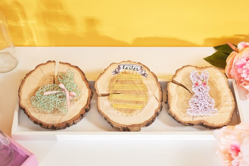 7. Nakonec pomocí silikonových razítek vytvořte transparent, který můžete označit podle libosti. Stačí ho vystřihnout a přilepit na disk stromu pomocí řemeslného lepidla. Vaše skvělá velikonoční dekorace je připravena.