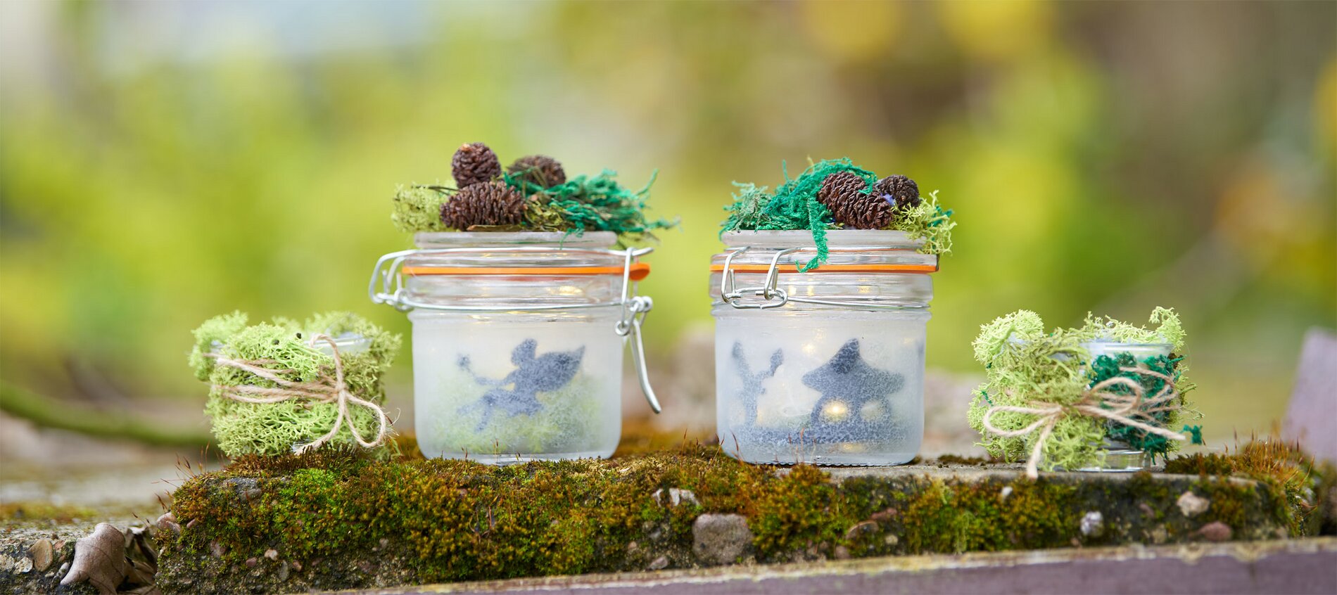 Víčka a sklenice s čajovou svíčkou ozdobte mechem, miniaturními šiškami a šňůrkou podle vlastního vkusu. Nakonec přidejte světýlka do malých čajových sklenic.