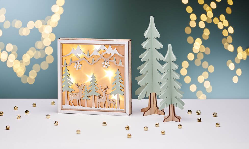Rámeček s motivem dřevěné stavebnice VBS "Jelen v lese" je dodáván s fólií s hvězdičkovým efektem a šňůrou LED světel. Přilepte fólii "Kouzelná hvězda" na vnitřní stranu dřevěného rámu a na zadní stěnu připevněte jednotlivá světýlka LED pohádkových světýlek.