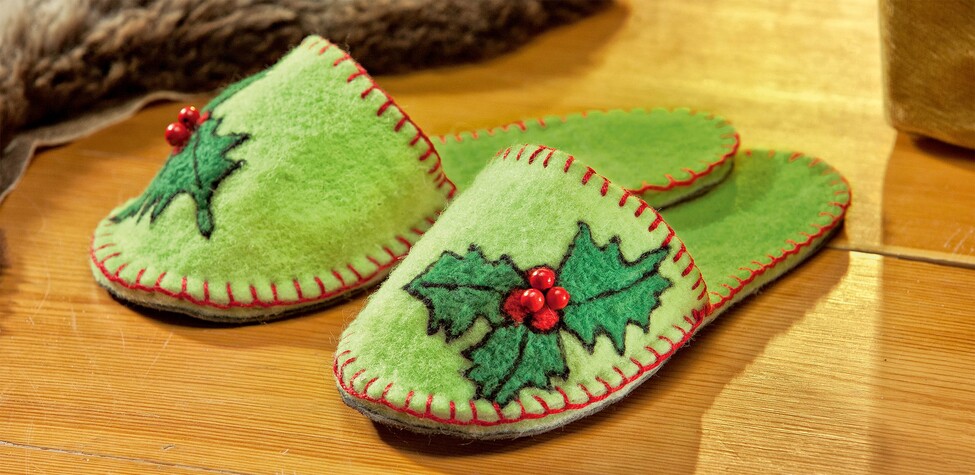 Nechte si je pro sebe, nebo je rozdejte - je to těžké rozhodnutí. Nadýchané bačkory jsou ušité z dvoubarevné plstěné stuhy a mají pevnou neklouzavou podrážku. Díky velkým plstěným motivům cesmíny a elegantnímu červenému ozdobnému prošívání se stanou vašimi oblíbenými.