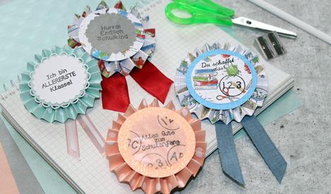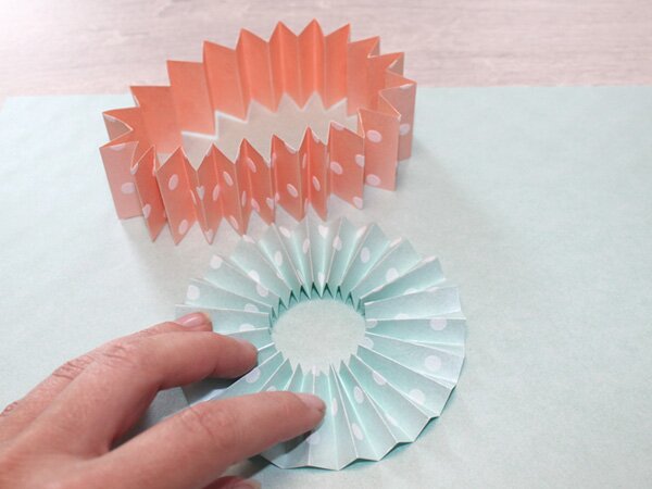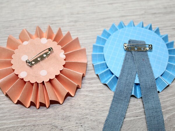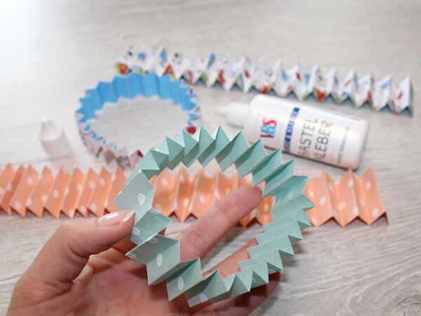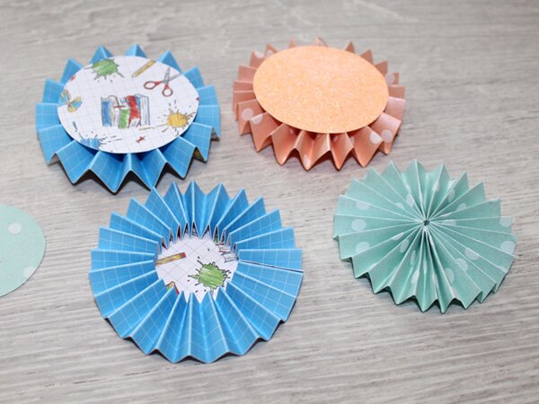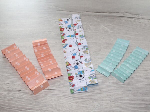 Používáte-li velké archy, postačí vám například jeden dlouhý proužek. Pro materiál velikosti A4 budete potřebovat 2 proužky. Pokud máte ještě kratší proužky, budete muset pracovat se 3 nebo více proužky. Šířka vašich proužků určuje pozdější průměr rozety. Pokud máte proužky široké 4 cm, bude mít vaše rozeta průměr nejméně 8 cm.