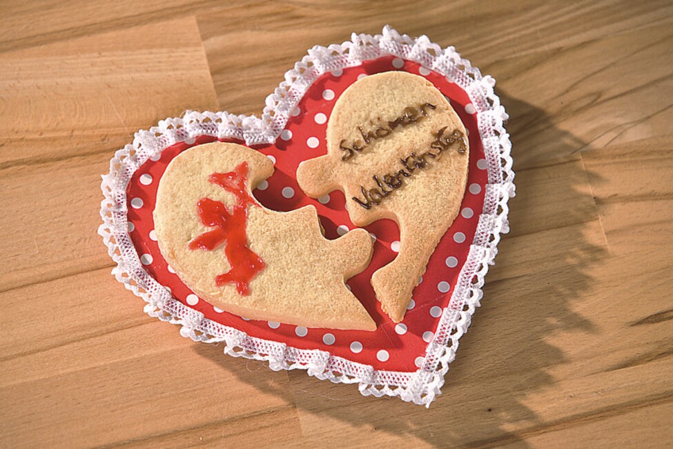 Po vychladnutí přeneste amorek na jednu polovinu sušenky pomocí cukrových per a na druhou polovinu napište.