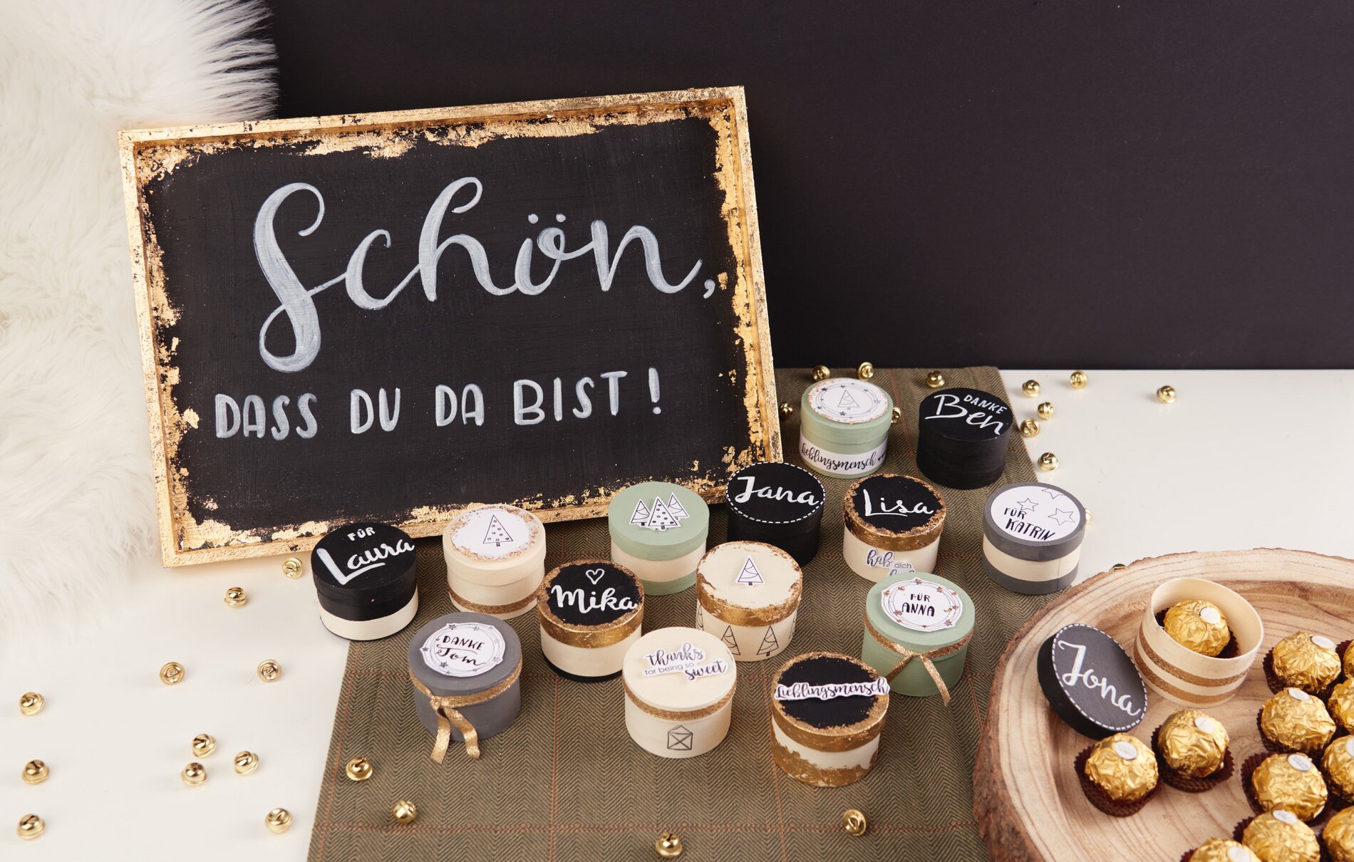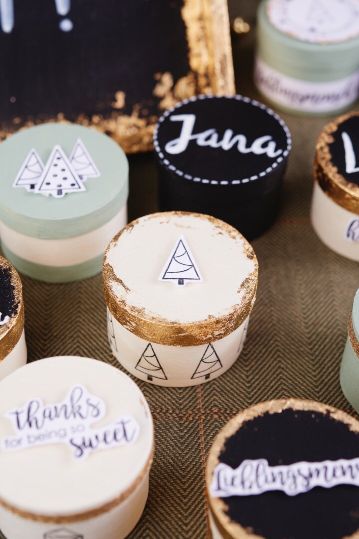 otiskněte pěkné motivy a vzkazy. Poté je vystřihněte nebo vyražte a pomocí řemeslného lepidla nebo 3D lepicích polštářků nalepte na papír nebo na krabičky na žetony. Nyní můžete