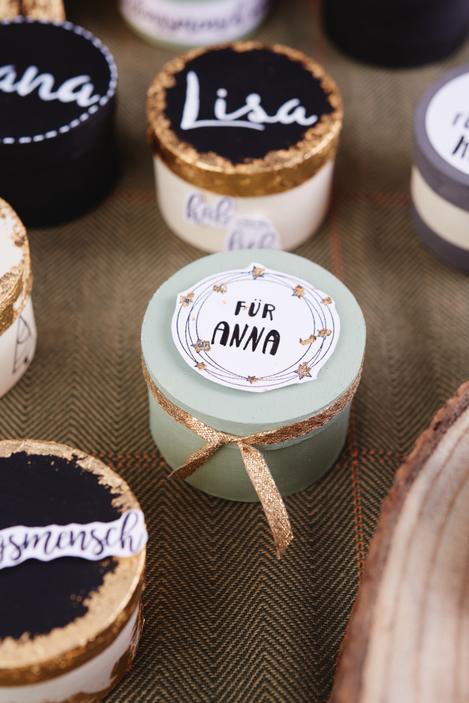 barvou na tabule VBS. Další dózy na dřevotřísku navrhněte barvou v kamenné šedé nebo pastelové olivově zelené barvě. Některé plechovky můžete také ponechat v jejich přirozené plechové barvě.