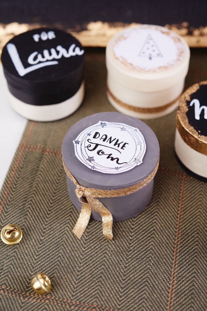 Křídovým fixem pište na křídovou barvu na tácu a na víka spandexových krabic natřených černou křídovou barvou. A nakonec některé krabičky na žetony ozdobte zlatou ozdobnou stuhou.