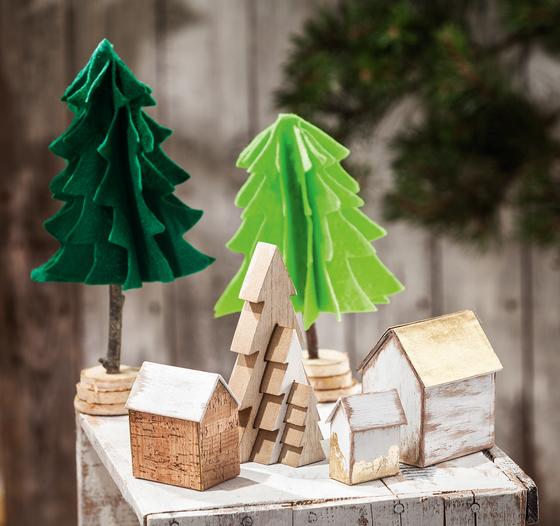 Doplňte aranžmá filcových stromků a kartonových krabic skutečnými dřevěnými jedličkami. Tuto trojici lze také ozdobit plstí nebo barvou podle vlastního vkusu.
