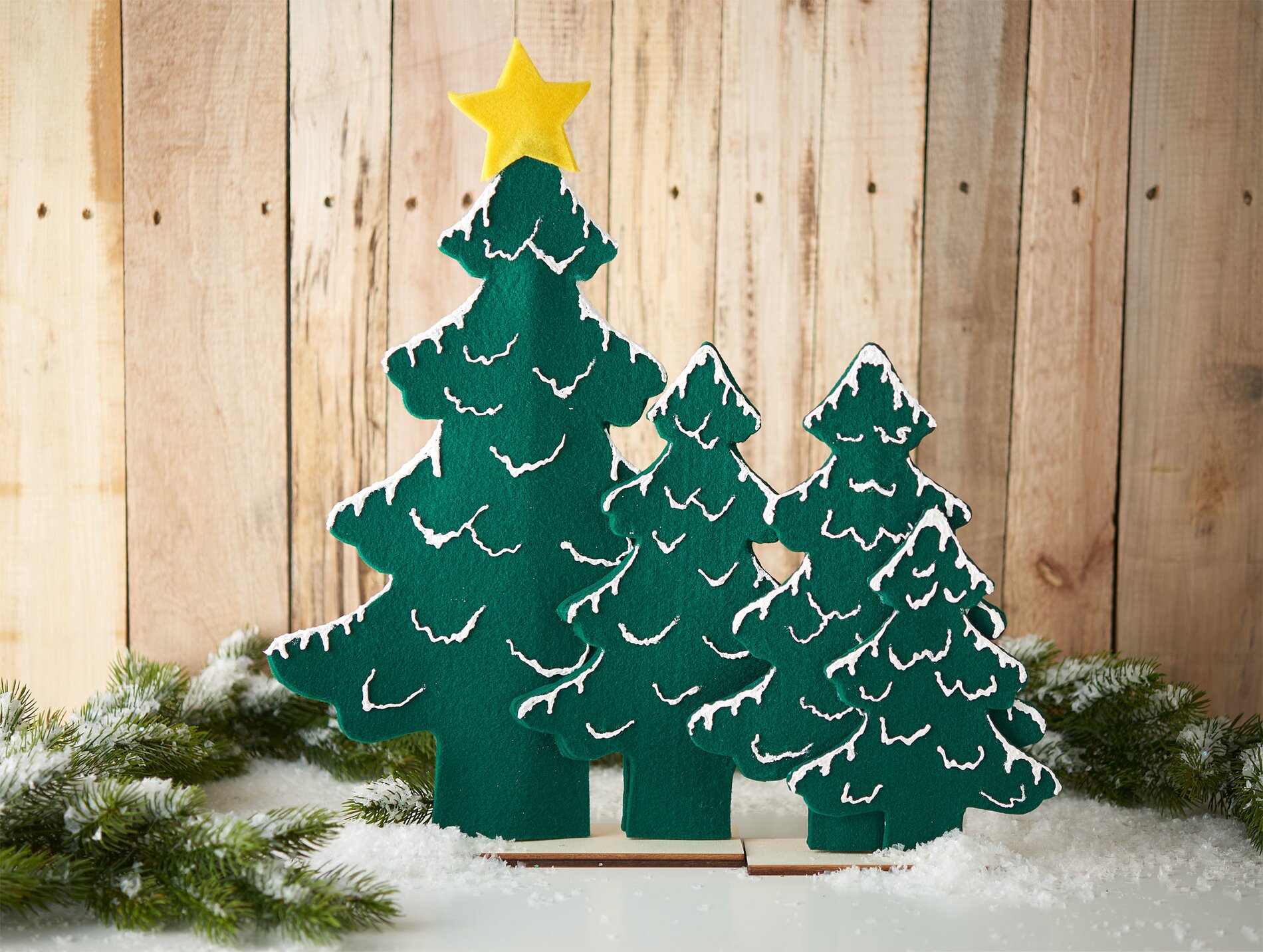 přeneste šablonu motivu dvakrát na plsť a vystřihněte vánoční stromky. Velká kreativní sada s vánočními stromky obsahuje také žlutou plsť. Tu můžete použít k vystřižení žlutého hrotu hvězdy.