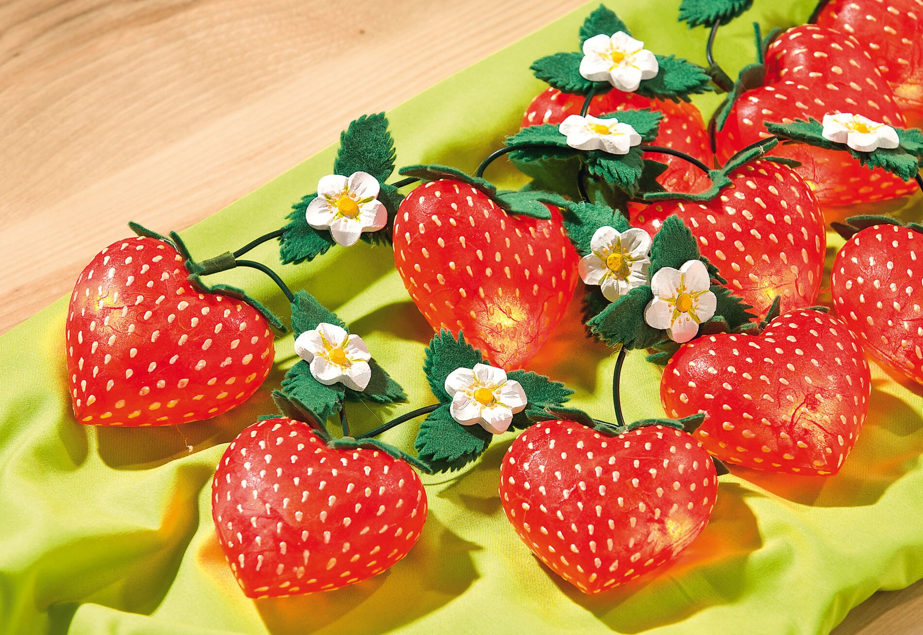 Tento světelný řetěz si zamilujete: V těchto pokynech jsou akrylová srdíčka pokryta slaměným hedvábím a vytvářejí svítící jahody.
