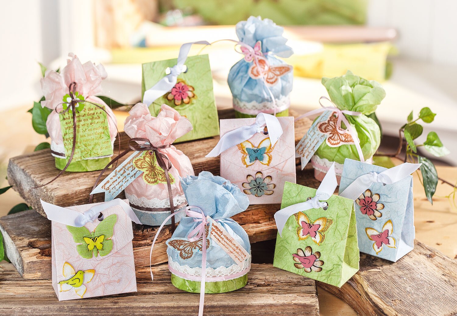 Jak dárkové krabičky ozdobit visačkami? Přilepte malé kousky slaměné nitě na fotokartu pomocí laku na ubrousky. Poté pomocí razítka aplikujte motivy motýlů a následně je vystřihněte. Nakonec můžete do visaček proděravět otvory a spolu s rozsypanými květy je připevnit na krabičky pomocí saténové stuhy.