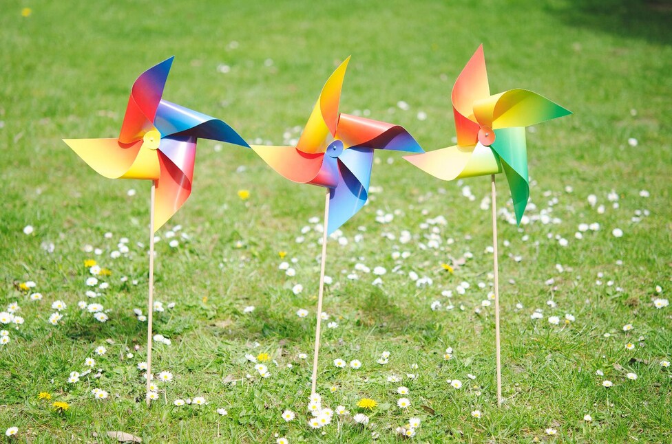 K výrobě větrníků budete potřebovat duhový karton, bukovou kulatou tyčku, špendlíky a vázací drát. Na jeden větrník jsme použili tyčku dlouhou asi 50 cm. Buková kulatá tyčka, kterou lze zakoupit v prodejně VBS, je dlouhá 1 metr. Stačí ji uprostřed rozdělit a získáte dřevěné tyčky na dva větrníky.